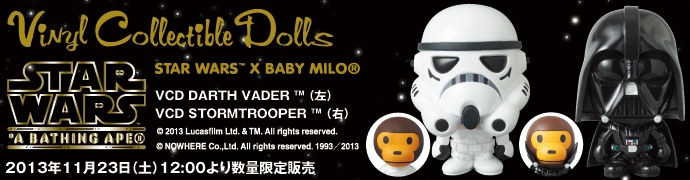 株式会社メディコムトイから A BATHING APE × STAR WARS BABY MILO VCD ダース・ベイダーとストームトルーパーが発売。
